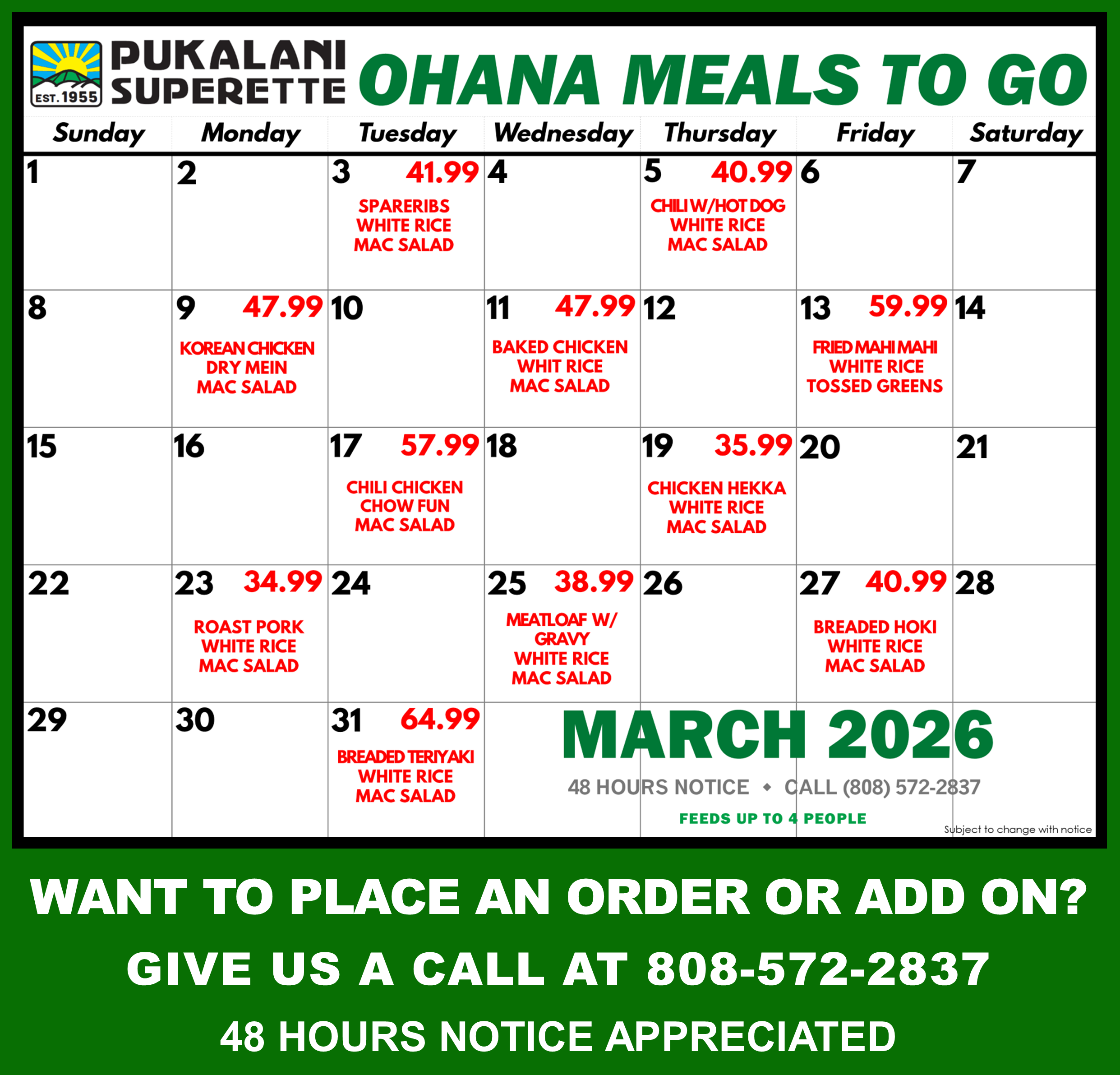 Give our Catering Department a call at 808-572-2837 to reserve your meals today.